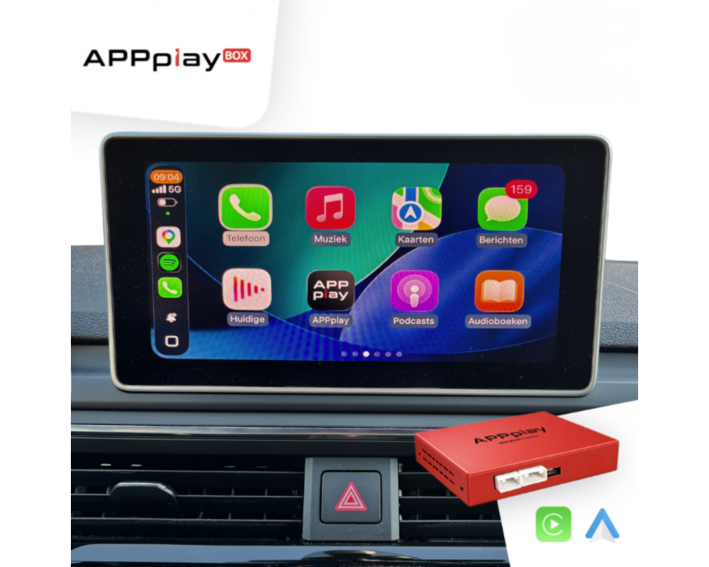 APPplay box, onze smartphone-oplossing, ondersteunt draadloze CarPlay- en Android Auto-integratie in uw bestaande multimediasysteem. U kunt de populairste apps van uw telefoon (zoals Spotify, Google Maps, Waze, WhatsApp en meer) gebruiken en alles bedienen via uw originele stuurwiel en MMI-controller, net als bij fabrieksgeïnstalleerde systemen.