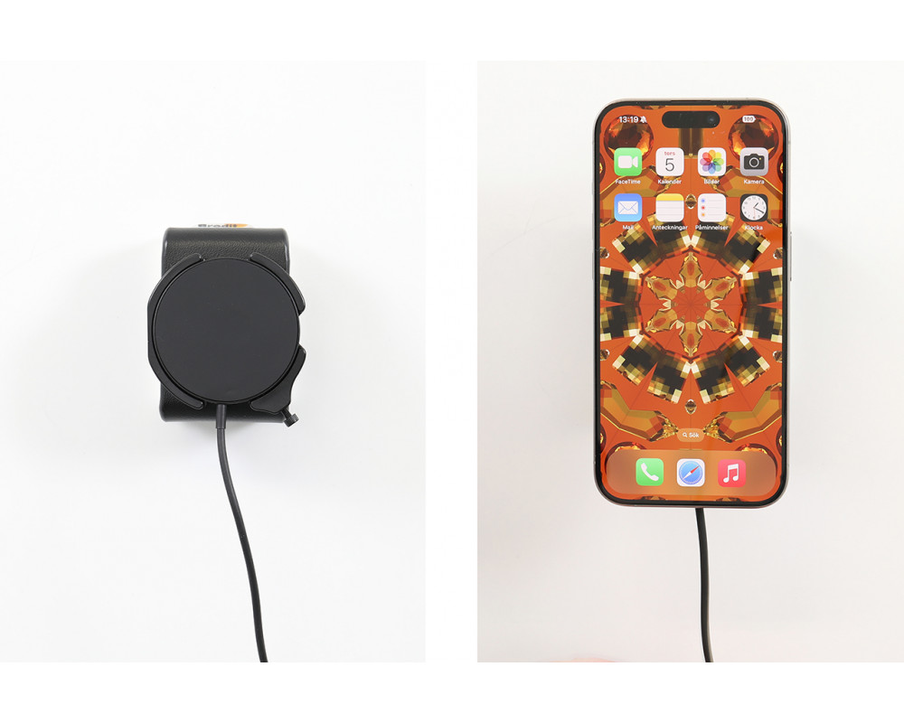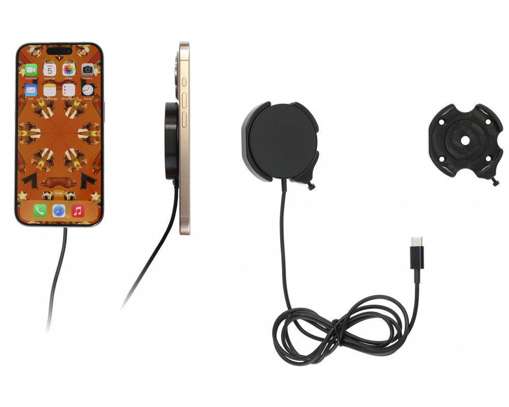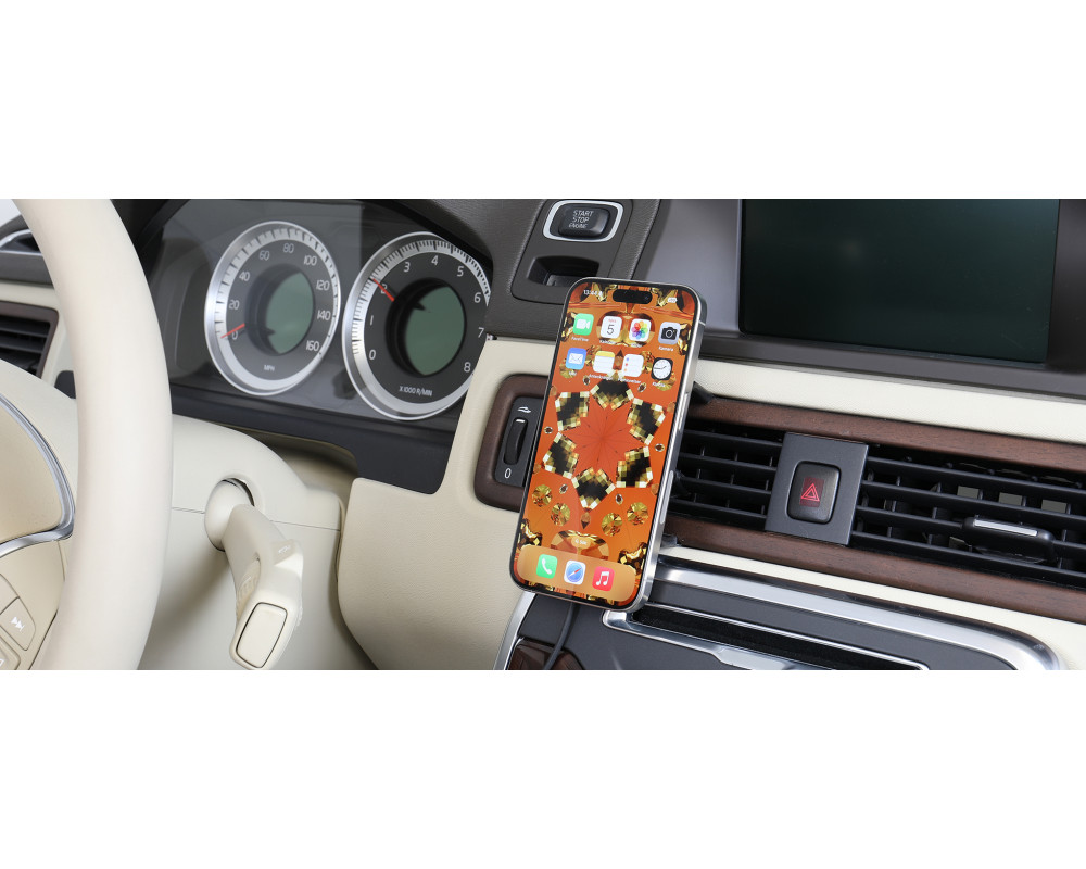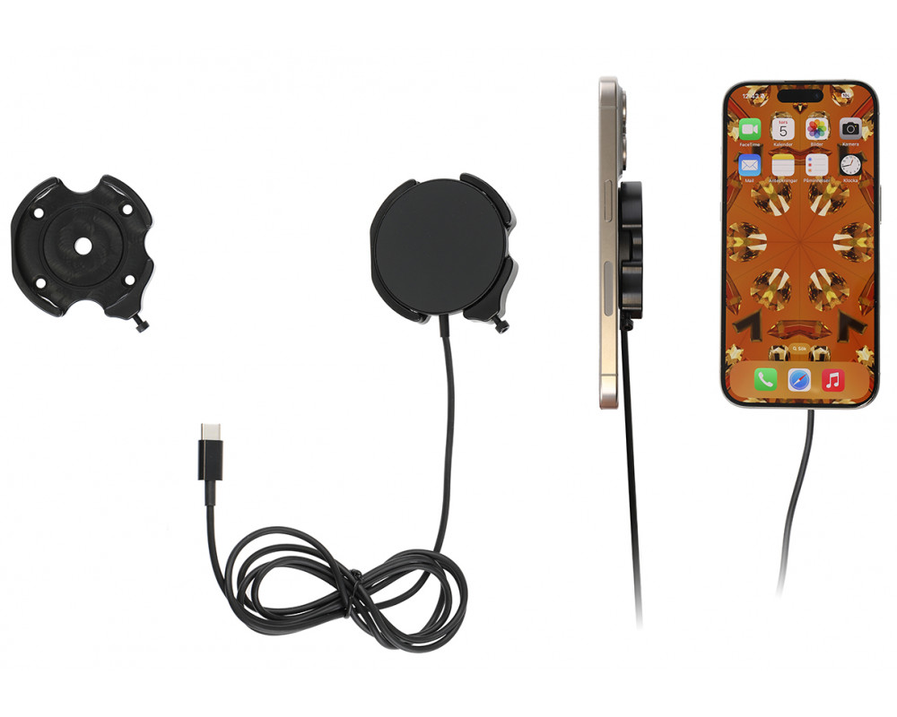Magnetische draadloze oplader, compatibel met Apple MagSafe-apparaten of Apple MagSafe-accessoires. Houd de batterij van uw iPhone volledig opgeladen in een houder met magnetische draadloze oplader, altijd binnen handbereik! Netjes, discreet en handig. Op maat gemaakt met een perfecte, stevige pasvorm. De iPhone wordt stevig rechtop gehouden voor maximale mobiele ontvangst. Gemaakt van hoogwaardig zwart ABS/Acetaal kunststof. Gemaakt in Zweden. Bevestig op een ProClip-montageplatform. Belangrijke opmerking: Dit product is niet compatibel met Magsafe-apparaten die zijn gemonteerd in een standaardhoesje/skin zonder Magsafe-ring.