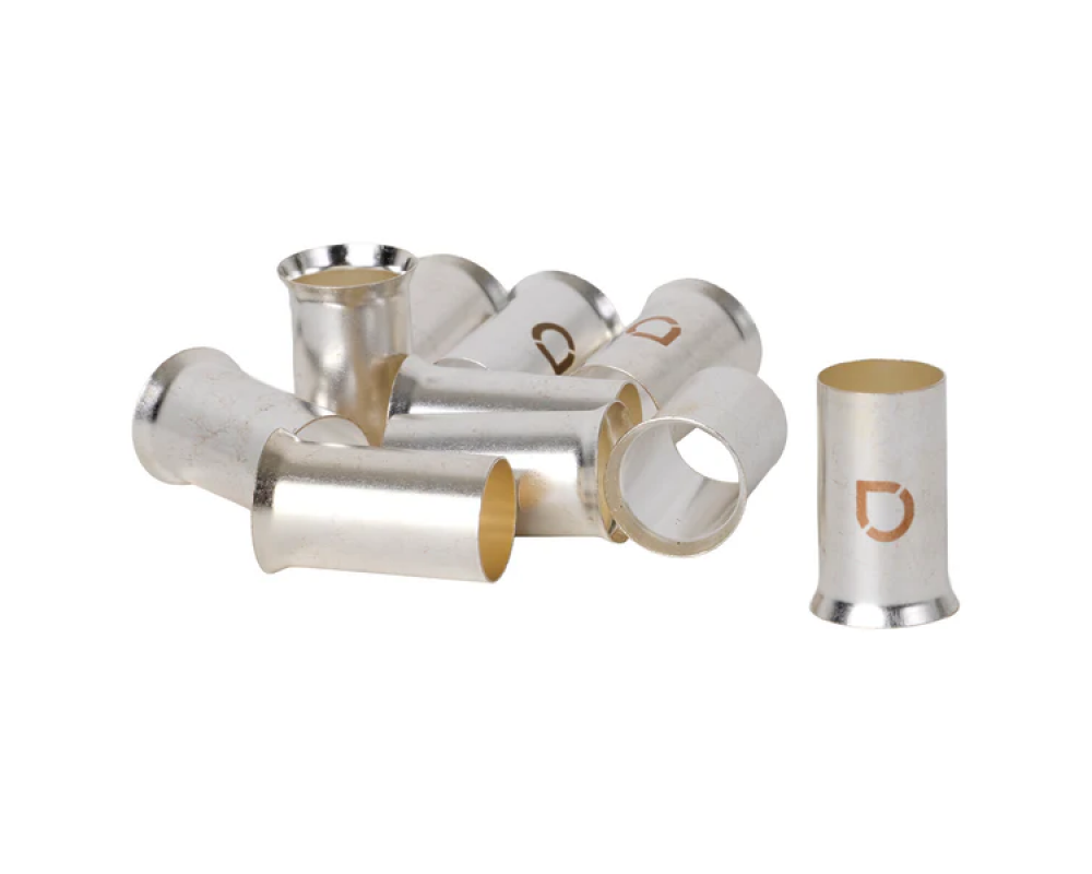 Ongeïsoleerde adereindhulzen voorkomen het uitwaaieren van aders en schade aan de geleider bij het aansluiten van voedings- of luidsprekerkabels in schroef- of klemterminals. Door de gestripte geleider volledig te omsluiten ontstaat een uniform contactoppervlak, wat de elektrische geleiding en mechanische stabiliteit verbetert. Hierdoor kan de kabel meerdere keren worden gemonteerd en gedemonteerd zonder rafelen of breuk. Afwerking met tape of krimpkous zorgt waar nodig voor extra trekontlasting en isolatie.