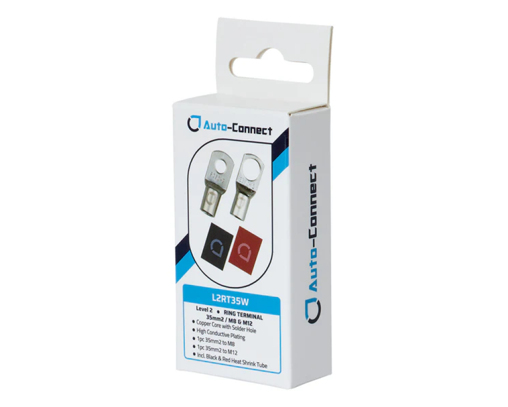 L2RT35W is een eenvoudig en gemakkelijk te gebruiken paar ringklemmen voor 35 mm² / 2 AWG stroomdraad met een M8 en een M12 gat. Deze ringklemmen zijn vertind voor een goede bescherming tegen corrosie en eenvoudig te gebruiken.