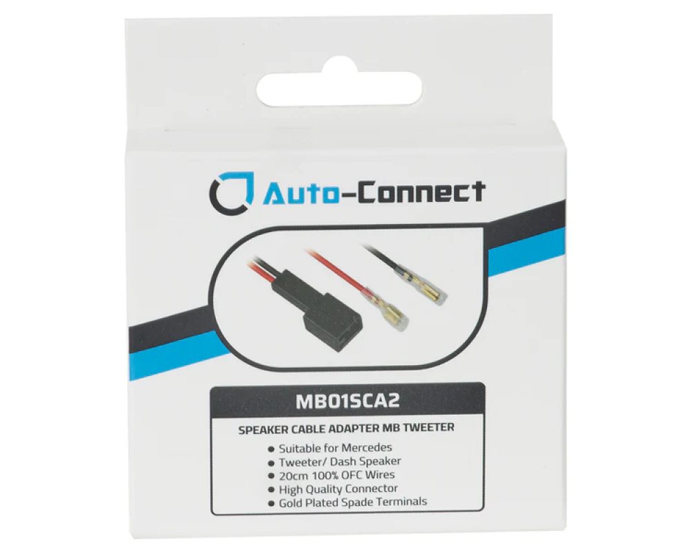 MB01SCA2 is een paar luidsprekerconnectoren die zijn ontworpen voor het aansluiten van aftermarket-luidsprekers op de fabrieksbedrading in compatibele Mercedes-voertuigen. Met deze connectoren kunt u de installatie uitvoeren zonder de originele kabelboom door te knippen of aan te passen.